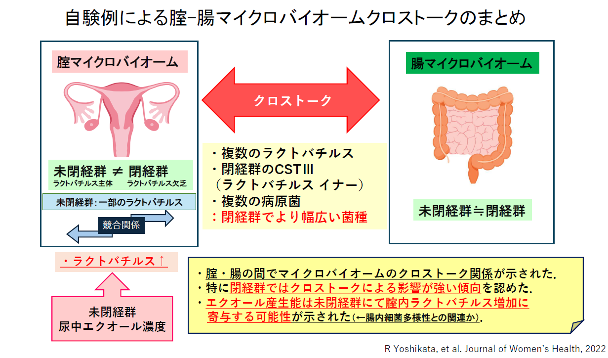自験例の検討から、複数の腟と腸のマイクロバイオームが相互に関連している(クロストーク)が認められます。腟マイクロバイオームは未閉経と閉経後で門レベルの構成に差異がみられ、一部のラクトバチルス同士は腟内で競合関係を示していました。さらに、未閉経群では尿中エクオール濃度とラクトバチルスとの正相関が観察されるなど、興味深い所見が得られています。