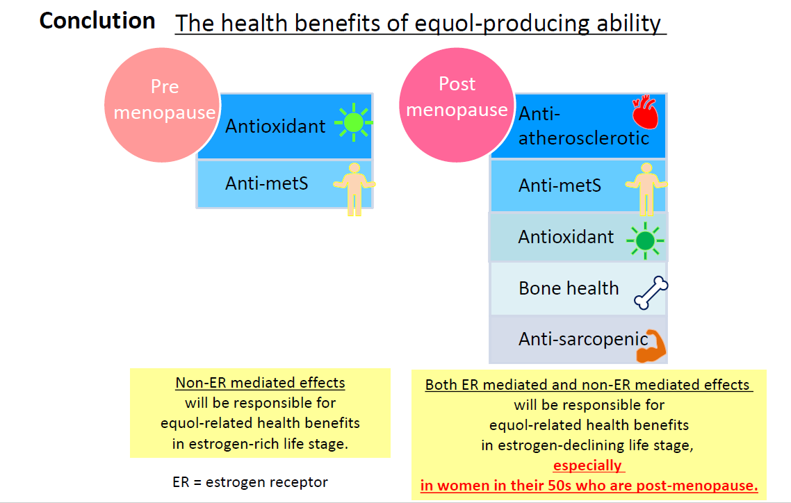 この研究は、女性の健康とエイジングケアにおいて、エクオール産生能の維持・向上が重要な役割を果たすことを示しました。