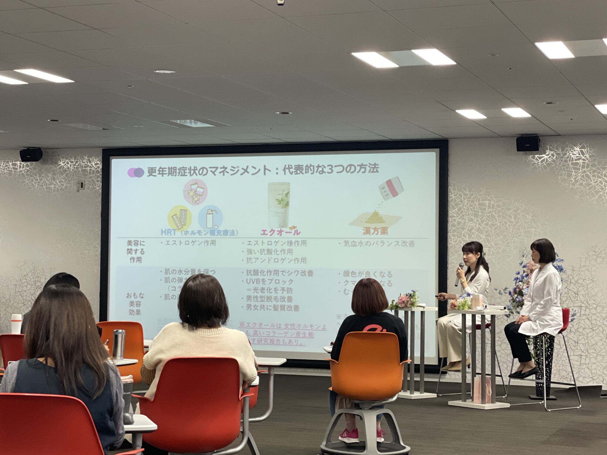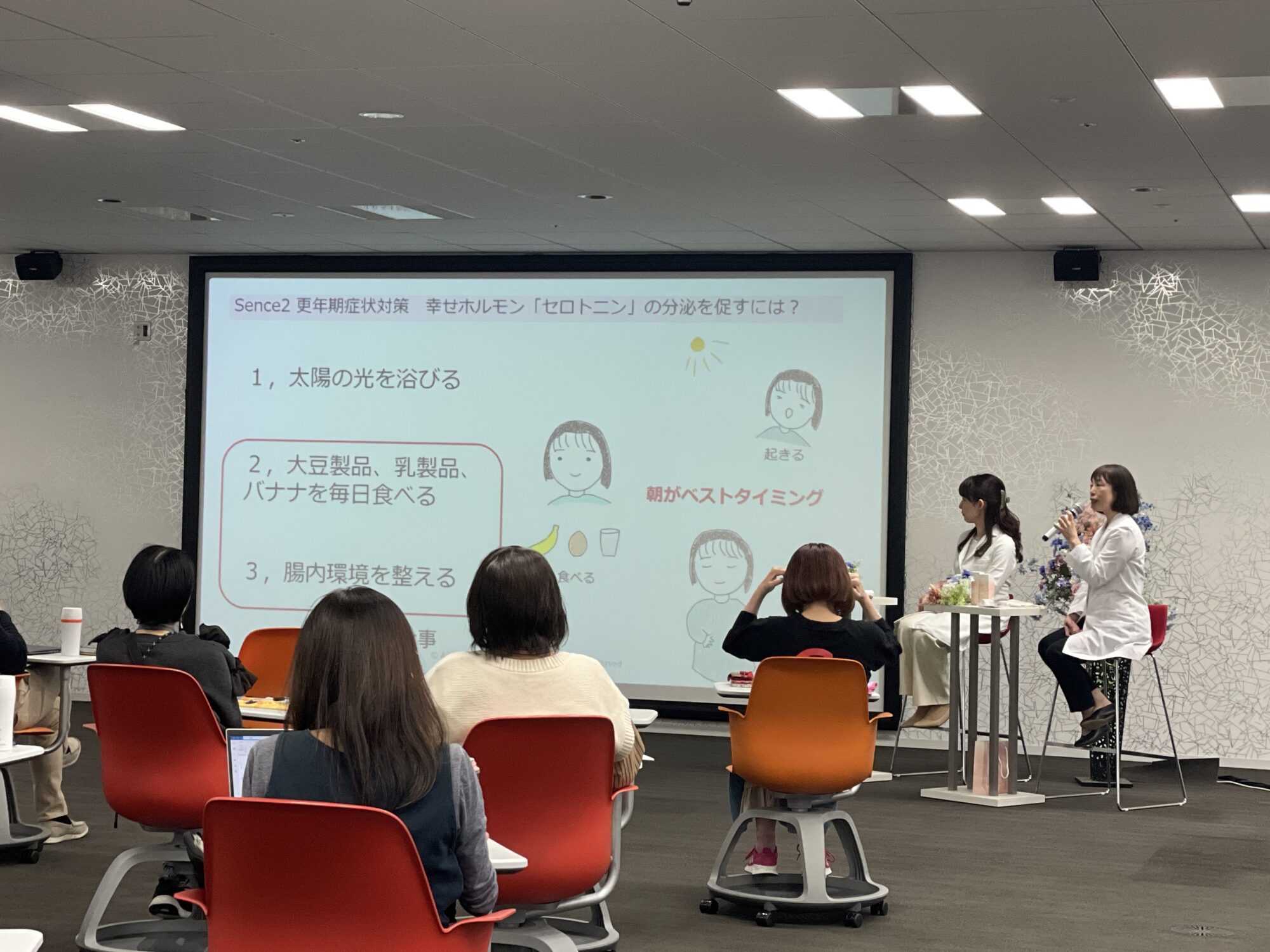 吉形医師からは、年齢とともに変化するホルモンバランスやその影響についてわかりやすく解説があり、三浦からは管理栄養士の視点で、心身をサポートする食事法や日々の食生活の工夫が紹介されました。