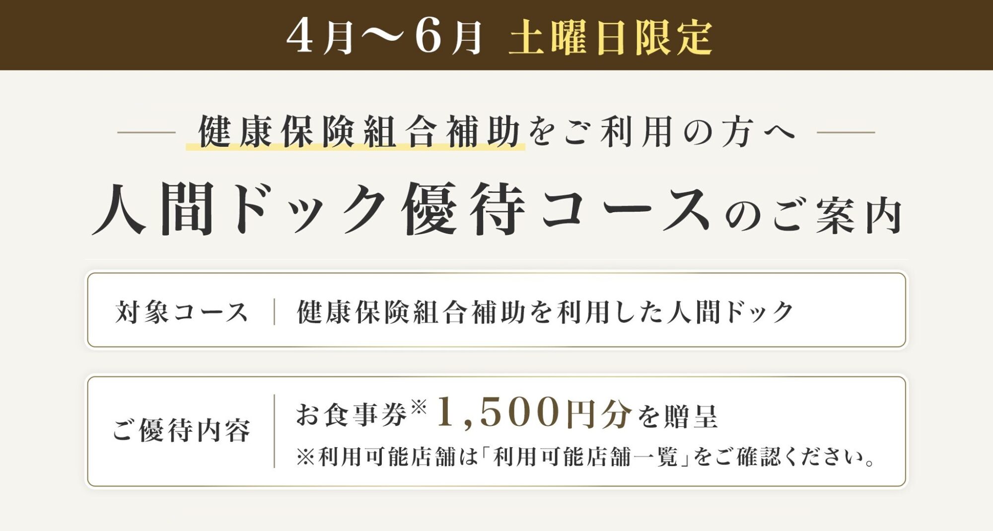 弊社が運営支援をする東京ミッドタウンクリニックでは、健康保険組合補助を利用して人間ドックをご受診される方に、”4月~6月の土曜日限定” で、東京ミッドタウンクリニックを含む対象店舗でご利用いただけるお食事券を贈呈しています。