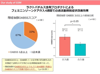 本講演では、吉形医師のグループが2021年に実施したラクトバチルス乳酸菌含有素材※5を使用したデリケートゾーンケア介入によるGSMおよび腟マイクロバイオームの改善効果についての研究成果の一部も発表されました。